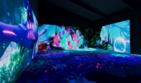 Interact with glowing shrimp, scuttling crabs, waving coral, floating whales, and schools of playful fish! Watch them follow you as you walk around the ocean floor, touch the walls to see them flip and dodge, and, at the end of your interactive session, take a seat on a soft rock-cushion and view the breathtaking 3-minute show, which takes you through the deepest depths of the ocean and up, through the clouds, into space...
